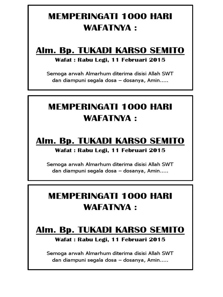 Ucapan mengenang 1 tahun meninggal word online, ucapan mengenang 1 tahun meninggal word to pdf, ucapan mengenang 1 tahun meninggal wordpress, ucapan mengenang 1 tahun meninggal word search, ucapan mengenang 1 tahun meninggal word count, contoh ucapan mengenang 1 tahun meninggal, ucapan mengenang 1 tahun wafat, cara membuat ucapan mengenang 1000 hari, contoh ucapan mengenang 1 tahun meninggal. 45 koleksi ucapan mengenang 40 hari terunik kumpulan ucapan kata mutiara dalam buku yasin buku yasin tanah. Pelaksanaan slametan biasanya berlanjut sampai pada hari ke 40 (matang puluh), pada hari ke 100 (nyatus), pada hari peringatan genap tahun pertama (mendak pisan), pada peringatan genap tahun kedua (mendak pindo), pada peringatan genap tahun ke tiga (mendak ping telu) atau slametan terahir yang menandai telah 1000 hari.biasanya dengan disertai ritual mengganti batu nisan. Souvenir handuk peringatan 1000 hari meninggal sh grosir. Jawa hari ke 1, 7, 40, 100, dan 1000. Contoh ucapan kotak nasi syukuran umrah cv kreatif berkat kotak Klik pada judul artikel untuk memulai membaca. Pin oleh lita paramita di mengenang 40 hari tulisan desain banner tanggal. Undangan tahlil dan yasinan 40 hari docx aktif. Membuat kartu peringatan 1000 hari utk nasi box area belajar inspirasional orang peringatan. Semoga kita selalu diberkati oleh allah yang maha kuasa, dalam nama bapa, dan putera dan roh kudus. Tas souvenir selamatan 1000 hari wafat. Panitia peringatan hari museum internasional 2013 di yogyakarta menyelenggarakan dialog refleksi dan doa bersama "peringatan 1000 hari hilangnya koleksi emas masterpiece museum sonobudoyo"